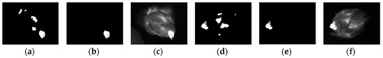 Where the corresponding candidate head regions are shown in Figure 7a,d, respectively. The relationship between the extracted head region and the gray-scale thermal image is shown in Figure 7c,f. Operations described in Section 2.3.1 and Section 2.3.2 were applied to all the 2185 thermal images in the database to locate the broiler’s head region. As a result, the head region of the 2027 thermal images were located correctly.