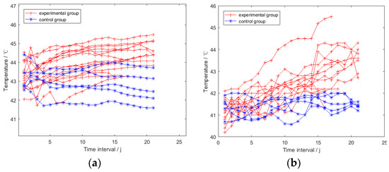 where is the smoothed value of the tth data point in the smoothed TSRHTi. NIHi and are the quantity of the elements and the jth element in TSRHTi, respectively. The smoothed TSRHT of the broilers in the experimental and control groups are shown in Figure 9a with red cross and blue star points, respectively. The corresponding under-wing temperature time series is shown in Figure 9b.