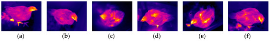 Operations described in Section 2.3.1 and Section 2.3.2 were applied to all the 2185 thermal images to locate a broiler’s head region. Thermal images were classified into the following six categories: (i) broiler body was well covered by feathers, and both feet and uncooled manure appeared; (ii) broiler body was well covered by feathers, and only feet or only uncooled manure appeared, or no feet and uncooled manure appeared; (iii) broiler body had sparse feathers, no feet, and uncooled manure appeared; (iv) broiler body had sparse feathers, and feet appeared; (v) broiler body had sparse feathers, an uncooled manure appeared; and (vi) broiler body had sparse feathers, and both feet and uncooled manure appeared. An example image for each category is shown in Figure 10.