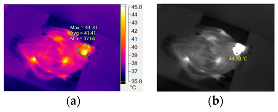 In recent years, thermal imaging technology has been successfully applied to obtain superficial temperature for cows [9], cattle [10], pigs [11], and so on. Based on the obtained superficial temperature, animal health was evaluated [12,13]. In the field of poultry breeding, thermal imaging has also been employed to obtain the surface temperature for broilers. For example, Giloh, Shinder, and Yahav [1] extracted broiler surface temperature from a thermal image. They found that broiler surface temperature is correlated to its body temperature. Liu, et al. [14] established a regression model between surface and core body temperatures for an individual broiler. However, broiler surface temperature in the existing research was extracted manually by using the specific software provided by the thermal imager manufacturer [15]. This is time and labor consuming, especially when the number of images is large and the ROI (region of interesting) areas are small.