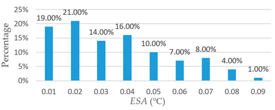 Figure 12 indicates that the maximum ESA of the head temperature, extracted automatically and manually, is less than 0.1 °C. Where 95% of the ESA are distributed in the range of 0.01–0.07 °C, it can be concluded that once the head region is located correctly, the head temperature can be extracted automatically with an acceptable accuracy.