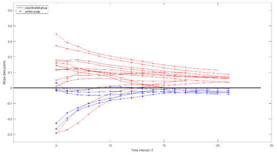 It was observed in Figure 9a that overall trends of slight increase and flat existed in the smoothed TSRHT of broilers in experimental and control groups, respectively. Slope of the straight line fitted by the first t′ (t′ [5, NIHi], ) elements in a smoothed TSRHTi, which was denoted by , was used to describe these two different overall trend features. For the ith broiler, all of its formed a slope time series. This series was denoted by and expressed in expression (11).