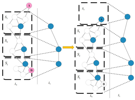 This establishment process is an incremental process. Figure 2 illustrates the updating process of the hierarchical pose-graph by taking a two-layer graph as an example. Suppose you have the graph structure on the left in Figure 2. Among them, S represents the subgraph, L represents the abstract level, the white points represent the layer nodes, and the blue points in the layer are selected as the layer nodes. There are already three subgraphs on the left. When two new nodes like red node A and node B need to be added, the distance between the node and the representative node in the nearest subgraph is used to determine whether to add an existing subgraph (such as node B) or establish a new subgraph (such as node A) on the right in Figure 2.