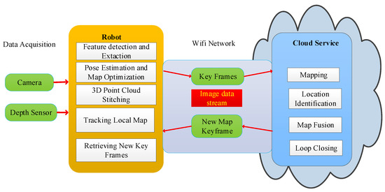 In view of the two disadvantages of (1) and (2), we propose the improvement of the original RGB-D SLAM in Section 4. For the third disadvantage, in the construction of a large-scale scene map, with the continuous operation of robots in an unknown environment, more and more data are collected by the RGB-D SLAM system, and the amount of information that needs to be processed by its back end will increase correspondingly. Especially in the later stages of reconstructing 3D maps of larger scenes in RGB-D SLAM system, the amount of information needed to be processed in the back end will be doubled, seriously affecting the real-time performance of the system. So, the algorithm in this paper unloads the back-end computation to the cloud in the 3D reconstruction system for improving the real-time performance of the system.