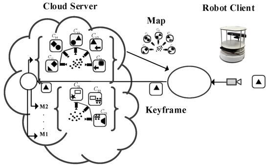 CTAM is a “cloud + robot” framework for collaborative mapping, which adapts to the cooperative SLAM problem [46,47]. It aims to solve the problems of map operation, map reuse, map expansion, and multi-machine collaborative mapping in SLAM through the resource advantages of the cloud. CTAM is based on PTAM (parallel tracking and mapping) method [48]. PTAM is based on the classical SLAM algorithm. According to the characteristics of the 3D map, the two processes of tracking and mapping are separated into two parallel steps from each iteration. On the one hand, the mapping side extracts common feature points through the observed images to form a whole image. On the other hand, the observer obtains the current position information by matching the current image with the whole image. CTAM chooses to put the composition part of PTAM into the cloud because it consumes more resources. Thus, the efficiency of SLAM is improved.