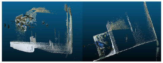 During the experiment, we assume that in a scene map A, the camera moves from desktop A to desktop B, and the point cloud is composed as shown in Figure 13a. At the same time, there is an estimated map of desktop B in the map of the cloud server, as shown in Figure 13b. When the camera moves from desktop A to desktop B and adds key frames to the map, the similarity between the new key frames and each key frame in other maps is checked to find the common features between the key frames, that is, the common maps with different maps.