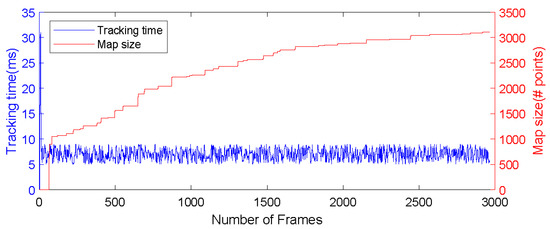 This shows that the tracking part can be completed on the robot’s onboard computer with limited local resources while ensuring the real-time performance of the tracking. It should be noted that the calculation in the front part of the sequence is about 30 ms, which is caused by the initialization of the first 25 frames, which does not affect the subsequent results of the experiment. During the entire tracking process, the time consumed by tracking has not changed much, but the size of the map is increasing. More and more information is included in the map. From the red curve in the map, it can be seen that the size of the map is increasing as time goes on.