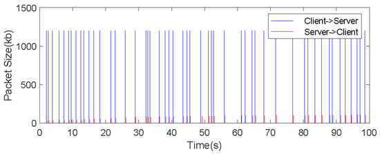 Figure 12 shows the bandwidth analysis under the same experiment. The blue peak data in the figure indicates that the map builder transmits the data to the cloud server. It can be seen that the heights of the blue peaks are the same because the keyframes sent by the client to the cloud server are the same size.
