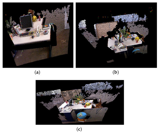 Comparing Map A and Map B, it is obvious that there are common areas, such as the computer, the tables, the telephone and the globe in both maps. However, there are no chairs in Map A and no books on the left side of Map A in Map B. For these two maps, it is necessary to fuse common information and preserve their respective non-common features. When the camera moves from A to B, the map fusion process detects the similarity between the current key frame and the previous map key frame, and fuses the two maps into one map, as shown in Figure 13c.