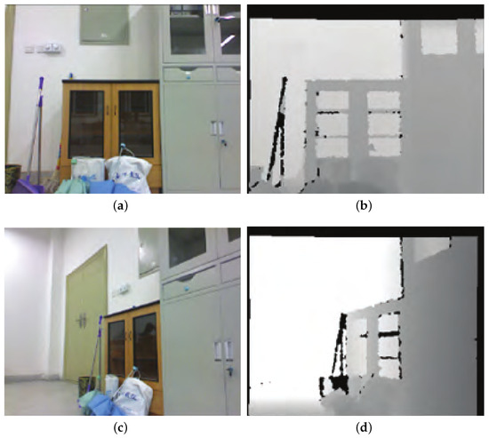 In order to verify the effect of the RGB-D SLAM based on cloud robot, we carried out a map building experiment on the 3D environment in the real scene. The RGB information and depth information of the two frame images used in the experiment are shown in Figure 14.