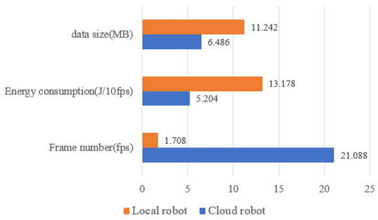 According to the RGB-D SLAM algorithm, the performance analysis and comparison of the RGB-D SLAM with the cloud robot and the RGB-D SLAM with the local robot are described. In this paper, three indicators are used as the measurement criteria: (1) Frame number (Fps). Considering that for the same SLAM task, the number of images to be processed is certain, so the problem affecting the efficiency of SLAM is to calculate the speed of processing the image. (2) Energy consumption (J/10fps), the robot itself is resource-constrained and includes its energy. Therefore, the energy consumption caused by performing the same SLAM task is also an important indicator to measure the efficiency of SLAM, in order to accurately describe the energy consumption brought by SLAM, which measures the impact of the architecture, is measured by its average energy consumption per 10 frames. (3) Network circulation data (MB). The amount of data interaction between robots and the cloud, the speed of data interaction are also important indicators affecting SLAM. As shown in Table 6 and Figure 17, compared with the local robot’s RGB-D SLAM, the number of frames combined cloud robot is increased from 1.7fps to 21fps, and the energy consumption per 10 frames is reduced from 13.2J to 5.0J. From the comparison results of the frame number, the method combined with the cloud robot can process the collected data in time and get SLAM results faster. So, in practical application, the robot can obtain the map and location information which can be computed by the current sensing data acquisition in almost real-time. In terms of energy consumption, because the computer module of SLAM process which consumes more energy is put from the robot to the cloud for execution, the energy consumption of cloud-based robot method is significantly reduced, which means that the robot can accomplish more tasks with limited energy and reduce the frequency of the supply and the maintenance.
