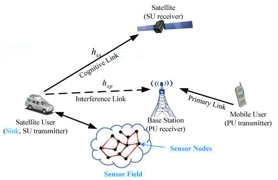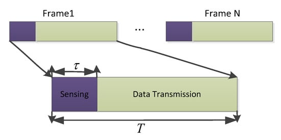 In this paper, we design the periodic frame structure, and the time duration of each frame is T. As shown in Figure 2, each frame duration consists of two parts: the sensing slot and the data transmission slot. During the sensing slot , the satellite user that acts as the sink of the sensor network can monitor the terrestrial network state through the sensor data. In addition, during the transmission slot , the satellite user adapts its power control scheme to access the channel assigned to a terrestrial network without degrading the communication quality of the terrestrial user.