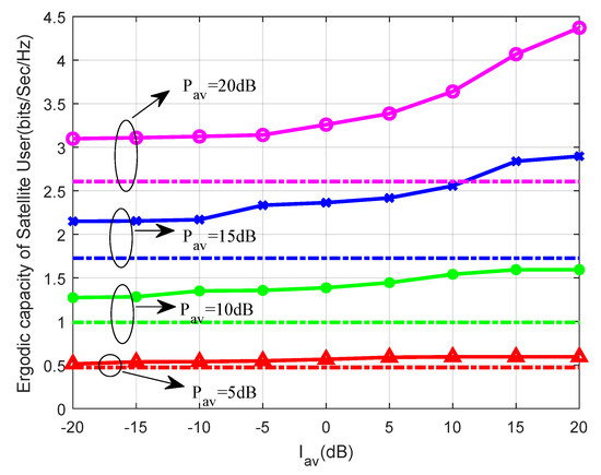 In Figure 5, we study the performance of the ergodic capacity of the satellite user versus for different with and . It is seen that ergodic capacity trends are consistent with the findings in Figure 4. Since the smaller values of correspond to the more severe fading condition of the interference link, which is a benefit for the satellite user link, the ergodic capacity is inversely proportional to . The result is consistent with the results obtained in Equations (7) and (27).