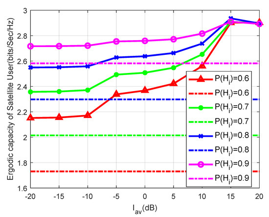 In Figure 4, it can be observed that the satellite network capacities increase with the increase of . This is due to the fact that the more idle the terrestrial user is, the larger the ergodic capacity that the satellite user can obtain. Furthermore, under the same , the ergodic capacities of the proposed approach are significantly higher than that of the opportunistic spectrum access approach. However, the capacity gap between the two approaches is smaller when the is higher; this is because the opportunistic spectrum access approach has excellent performance if the terrestrial user is always idle. Moreover, we can see that the ergodic capacities of the proposed method become saturated when the is large, since the transmit power becomes the main constraint.