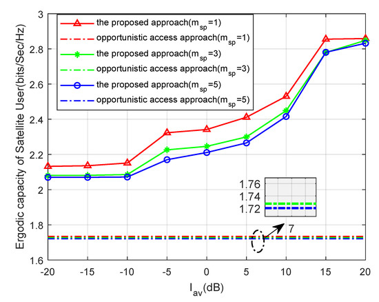 In this part, the continuous lines and the dash dot lines refer to the capacities of the proposed method and the opportunistic spectrum access approach, respectively. Figure 3 shows the ergodic capacities of the paper proposed increasing with and . However, the capacities of opportunistic spectrum access approach only increase with . This is because the satellite user can only access the channel with the fixed transmission power while the terrestrial user is idle without considering the power constraint in the opportunistic spectrum access approach. In addition, it is obvious that the proposed approach leads to higher values of ergodic capacities compared with the opportunistic spectrum access approach in all the considered scenarios.