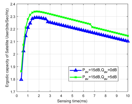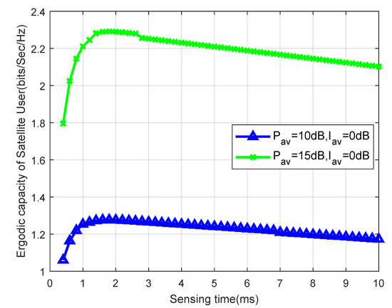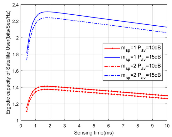 In Figure 8, we present the ergodic capacity of the satellite user versus sensing time with different and . It can be clearly observed that the trend of ergodic capacities is consistent with the findings in Figure 6 and Figure 7, and the achievable ergodic capacity being higher corresponds to a larger . Furthermore, it is noted that, with the difference of , the optimal sensing durations are almost the same. However, along with the decrease of , the ergodic capacity of the satellite user increases for the same , since the smaller the value of , the more severe the fading conditions of the interference link become.