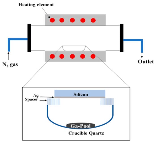 Schematic of the growth process of Ga2O3 NWs on Si substrate coated with 5 nm thin film of Ag and positioned downward to face liquid Ga pool in a quartz crucible. The distance between Ga pool and silicon substrate is about a ~10 mm gap.