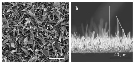SEM images of Ga2O3 nanowires growth on Si at 950 °C (a) Top view and (b) Side view of Ga2O3 nanowires growth on Si. Denser and longer growth of nanowires were attained.