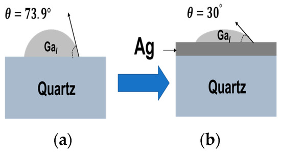 Contact angle of liquid Ga droplet on different surfaces. (a) Silicon. (b) 5 nm silver thin film. Areas coated with 5 nm Ag show uniform and high-dense growth of Ga2O3 nanowires.