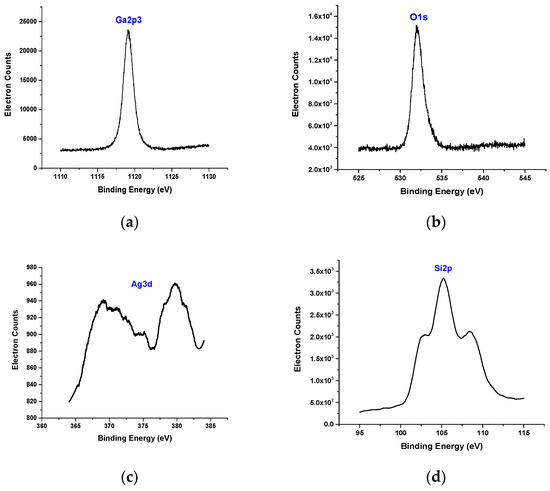 XPS of the β-Ga2O3 nanowires was obtained at 950 °C and in the presence of an Ag catalyst. Different peaks were detected by XPS. (a) Ga. (b) O. (c) Ag. (d) Si. The peaks of Ag and Ga have positive slight shifts due to the difference in electronegativity and work function.