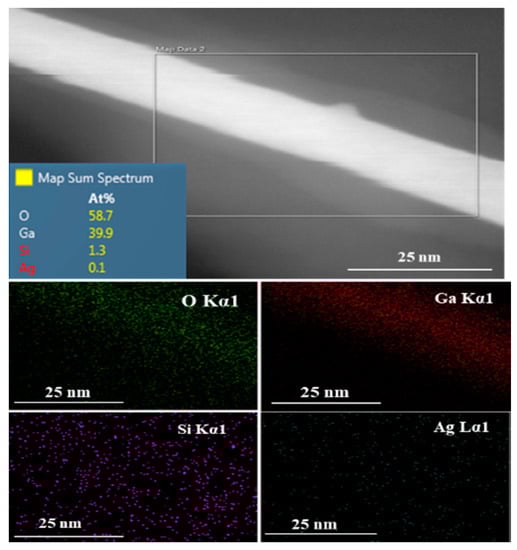 An energy-dispersive spectroscopy (EDS) profile analysis was performed on β-Ga2O3 nanowires grown on Si (Figure 5). Interestingly, none of the Ag nanoparticles were clearly observed on the surface of the nanowires. However, a very small amount in atomic percentage of Ag was detected by HRTEM equipped with EDS. Because no Ag was observed on the nanowire surface, a very small amount of Ag might be embedded into the Ga2O3 nanowires. These remaining Ag nanoparticles could be trapped inside the nanowires after all Ag was consumed and evaporated.