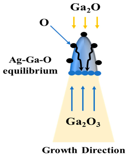The growth mechanism of Ga2O3 NW on a silicon substrate coated with 5 nm Ag as a catalyst. The equilibrium liquid mixture of Ag-Ga-O at higher temperature (>900 °C) leads to the enhancement of the growth mechanism and increases the density of Ga2O3 NWs.