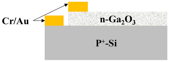 Schematic diagram of Au/β-Ga2O3/Silicon photoconductor. The distance between the gold probes is 0.8 mm.