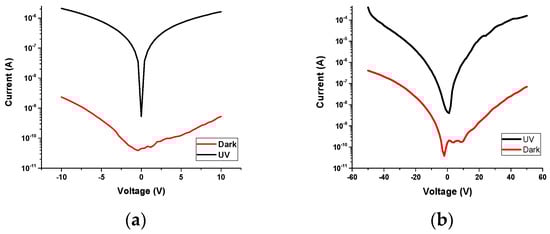 The current-voltage (I-V) characteristics were measured in dark conditions and under UV illumination at different voltages 10 and 50 V. Photocarriers, which were excited by UV illumination, were from a Dymax Bluewave 75 UV lamp (280–320 nm) (Dymax Corporation, Torrington, CT, USA) (Figure 8). The photoconductivity mechanism of the β-Ga2O3 NWs is credited to a surface oxygen adsorption and desorption process [56], which is highly influenced by the presence of silver as a catalyst, leading to improve oxygen detection and hence the electrical properties of the β-Ga2O3 nanowires.
