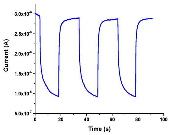 The transient response of the photodetector was measured by turning on and off a UV light source with wavelength range from 280 to 450 nm (Figure 9). Under UV illumination, the oxygen adsorption and desorption processes are attained to improve the photoconductivity response by increasing the carrier mobility. In contrast, when UV illumination is switched off, the excess electrons and holes recombine rapidly. Ga2O3 on silicon with Ag catalyst showed a rapid transient response due to the enhanced carrier transport. The rise was 0.8 s and fall time was 1.5 s. Due to the enhanced carrier transport process, fast rise and decay of the photocurrent were obtained.