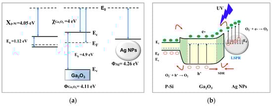 UV detection mechanism is determined based on the contribution of two different parts, namely, Ag nanoparticles catalyst and P+-silicon. Under UV illumination, when the photon energy is larger than the bandgap of Ga2O3, carriers (electron-hole pairs) are generated [hv → e− + h+]. These enhanced photo-generated carriers by the large electric field increase the carrier density in β-Ga2O3 nanowires and improve the photocurrent response. The energy band diagrams of the AgNPs/ β-Ga2O3 /p-Si p-n junction is shown in Figure 10a. The band offsets values are estimated using the electron affinity 4.05 eV [62], 4.00 eV [63], and band gap 1.12 eV, 4.9 eV for p-Si, and β-Ga2O3, respectively. The work function (φGa2O3) and electron affinity (χGa2O3) of β-Ga2O3 are 4.11 eV and 4.00 eV [63], respectively. This is lower than the work function of Ag (4.26 eV), leading to the formation of a Schottky barrier which prevents the electrons transport from Ag NPs side to Ga2O3. In addition, Ag NPs on the surface of Ga2O3 is highly influenced with UV light below 320 nm due to the interband transitions, exciting the transition of highly energetic hot electrons from the 4d and 5-sp bands [64,65,66]. These hot electrons surmount the small height of Schottky barrier and lead to local band bending downward on the Ga2O3 side to enable the electron transfer to the conduction band of Ga2O3 nanowires.