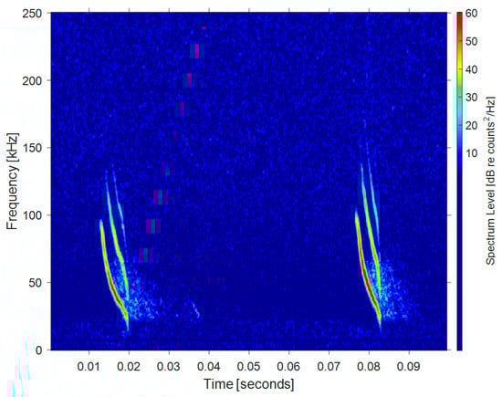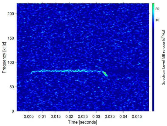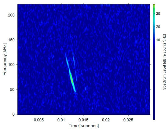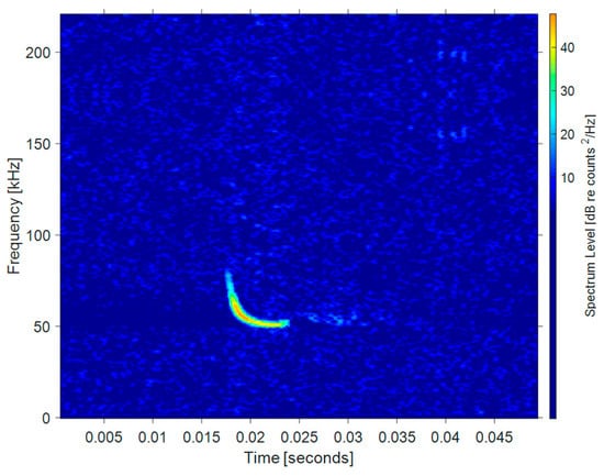 Wideband FM wave: This type of signal is a very short (only a few millisecond) frequency-modulated (FM) wave, which is the most common wave among bats using echolocation. Such ultrasonic waves are usually short in wavelength, wide in spectrum, have good time resolution, and can be used to quickly determine the direction, distance, and characteristics of the target. Bats can utilize accurate time measurement and binaural time difference for localization [17]. Figure 1 shows the echolocation signal of Bechstein’s bat (Myotis bechsteinii). The data below are from Bat Ecology and Bioacoustics Lab, University of Bristol [18]. The signal is a steep modulated down-chirp FM wave, with a main frequency ranging from 40–100 kHz and duration time of about 2 ms.