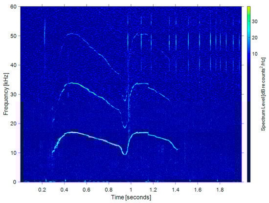 Bats’ echo signals and dolphins’ whistle signals usually contain harmonics in one complete pulse, but this is not consistent across species or families [5,19]. The harmonics of some species are a multiple of the fundamental frequency [5,20,21,22]. Each harmonic has a specific frequency or range of frequencies. Bats increase their ability to discriminate objects by using directional sound waves with multiple harmonics. When bats prey on insects in complex environments, a series of harmonics may help them reduce clutter [5,19]. Figure 4 shows the time-frequency distribution of the harmonic components in the vocal signal of Myotis nattereri. Similar to bats, Figure 5 shows the whistles (left half) and clicks (right half) of a real bottlenose dolphin. It is generally believed that dolphins use whistle signals for inter-individual communication and high frequency short clicks to detect targets [5]. As can be seen, the whistle signals have obvious harmonic characteristics.