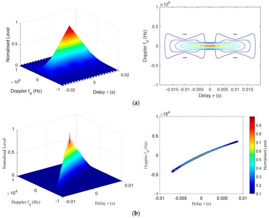 Continuous wave (CW) signal and hyperbolic frequency modulation (HFM) signal ambiguity: (a) Surface and contour plots of the CW signal ambiguity function. (b) Surface and contour plots of the CW signal ambiguity function.