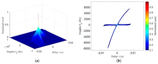 Figure 6a shows the ambiguity function of the CW signal with frequency of 16 kHz and a pulse width of 0.02s. The function was calculated using Equation (1). It can be seen that the attenuation of the main lobe along the time axis is slow and the attenuation along the frequency axis is fast. That is to say, the long CW signal has a large time measurement blur, which is not conducive to the distance measurement of the target. When measuring the velocity of the moving target, the Doppler effect of the target echo occurs, and the frequency offset is generated. The CW signal can accurately reflect the offset, which is an advantage for accurate target velocity measurement. Therefore, the single frequency signal is also known as a Doppler-sensitive signal.