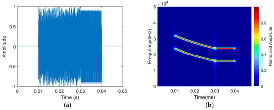 Considering the existence of harmonic information in the mammal sonar signal, we also added multiharmonic information to the detection signal and used multiscale matched filtering (detailed in Section 4) to obtain as much information as possible from the echo. The frequencies of the harmonic information were 32–24 kHz for the HFM information and 24 kHz for the CW information. We intended to use 8–16 kHz as the fundamental frequency, and 16–24 kHz and 24–32 kHz as harmonics, however, due to the band limitation of the transducer in the experiment, we had to use 16–24 kHz as the fundamental frequency. In order to facilitate subsequent processing, the harmonics in this paper were made to not overlap with the frequency of the fundamental frequency, and only harmonics twice the fundamental frequency were added. Figure 8 shows the short-time Fourier transform analysis of the HFM-CW multiharmonic signal.