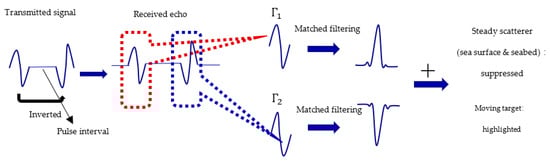 where corr indicates the correlation calculation. Under real conditions, the result of the p+ calculation cannot be 0, but because of the environmental noise and small changes in the channel, under the condition of an appropriate pulse interval, this method can effectively distinguish the moving target from steady scatters. The pulse interval determination will be introduced in Section 4.1. The main process of twin inverted matched filtering is presented in Figure 9.
