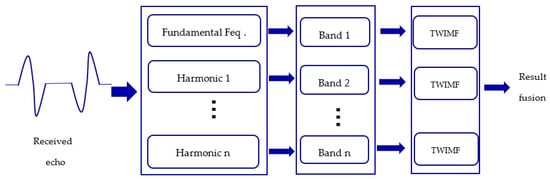 In Section 3.1, we introduced a Twin inverted matched filtering method to suppress reverberation and detect a moving target. The sound source transmits a time series signal, , and here can be replaced by the signal designed in Section 2.2. However, how do we utilize this harmonic information? In this paper, a twin inverted multiscale matched filtering method is proposed as a solution. The idea is quite simple, where the echoes are divided into several bands according to the designed harmonic bands (in this paper, the bands are divided using simple FIR band-pass filters), and each band is processed separately using twin inverted matched filtering for the combination of results. The main process of this method is presented in Figure 10. By using this method, we can utilize as much information from the harmonic echoes as possible. Large bandwidth detection signals can bring more target structure information, and this is also why mammalian sonar uses broadband signals to detect targets. Besides, in an underwater environment, the channel usually fades frequency-selectively [25,26,27]. The frequency selective makes the underwater multipath channel more like a comb filter, where some frequencies will be filtered, and, therefore, this will lead to information loss. Additionally, in different frequency bands, the propagation loss is also different, usually in the higher frequency band, where the propagation loss is much higher, however, more target information can be obtained. Therefore, after the band division processing, the echo information of the target in different frequency bands can be obtained, and finally the detection results of every frequency band are combined. Here, in this paper, result combination is just the linear superposition of intensity. This method can effectively improve the detection performance.
