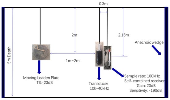 The experiment was conducted in the channel pool of Harbin Engineering University. The pool was about 30 m long, 8 m wide, 5 m deep, with anechoic wedges on both side of walls. The bottom of the pool was flat and made of concrete. As such, the reverberation was mainly from the water surface, bottom, weak flection of the anechoic walls, and higher order reflection from the bottom and surface. The transducer, receiver, and target were arranged according to Figure 11. The transducer bandwidth was 10–40 kHz, with two obvious resonance peaks at 18 and 27 kHz, and the transmitting response was higher at 10–20 kHz and lower at 20–40 kHz. The receiver was a self-contained hydrophone, with a −190 dB sensitivity and 20 dB amplification gain. The transducer and receiver were staggered to prevent reverberation between each other. The target was a leaden plate, with a diameter of 27 cm, and as such the largest target strength (i.e., facing the round part) was about −23 dB. Because the leaden plate was too heavy, it was difficult to keep its round face facing the transducer, so, during the movement, the leaden plate would rotate about a maximum of 30 degrees, so the target strength decreased. The target was at the same depth, with the transducer controlled to move back and forth at the distance of 1–2 m to the transducer to simulate a moving target, at a speed of about 20–40 cm/s.