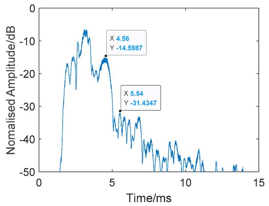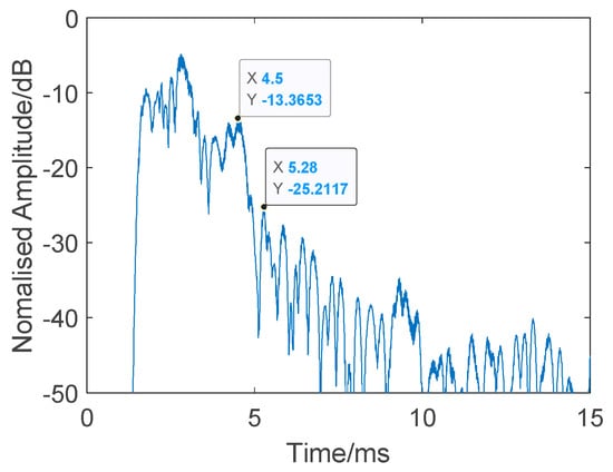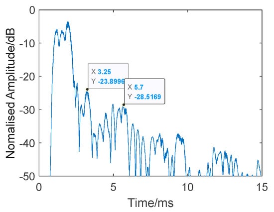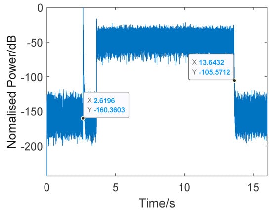 Figure 12 shows a single test result. The transmitted signal, determined using Equation (8), consisted of a 16 kHz CW probe and band-pass Gaussian white noise (, where the the pass band was 16–32 kHz). The CW probe was used as a synchronization head for accurate time measurement. The total length of the signal was 11 s, starting at 2.6196 s. The average energy of the received noise was about −44.5dB, and, at the time of 13.6432 s, the reverberation energy had decreased by 60 dB. Here, we calculated the reduction time to be about 0.0236 s. Considering the actual distance of the target set in the experiment, and the good channel conditions, the pulse interval was set as 0.1 s and pulse width was set to 1 ms to guarantee the target information was entirely acquired, even though the interval could be much shorter than 0.1 s.