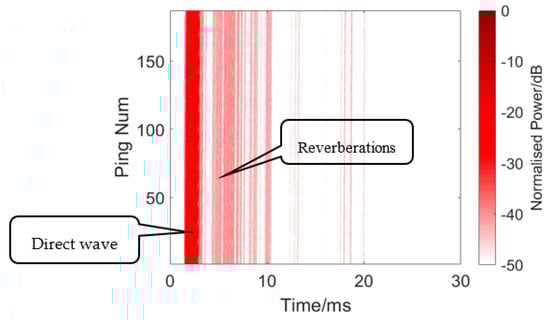 The first problem concerns the messy reverberations shown in Figure 17 and Figure 19. Are these present because the twin inverted method did not suppress the reverberation very well? Due to the experimental conditions, the target was close to the receiver and transducer, which results in second order (or even higher) reverberations between the transducer and the target, as well as between the receiver and the target. The higher order reverberations will interfere with the strong reverberations from the surface and bottom, causing changes in the waveform of the strong reverberations, eventually affecting the reverberation, suppressing the performance of the twin inverted matched filtering method.