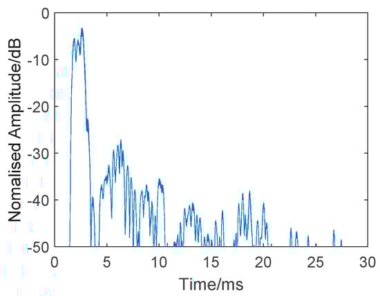 Before the detection experiment, a simple channel estimation was also conducted by a correlation operation of the received echo and transmitted signal (24–16 kHz HFM signal), without a target. The result is presented in Figure 13. We can see strong reverberations after the direct wave. Figure 14 shows a single measurement of the channel.