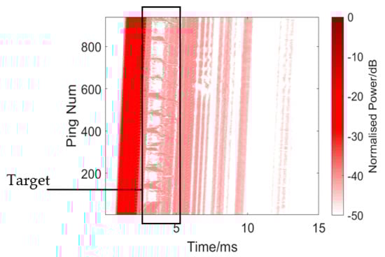 The twin inverted matched filter was applied to process the echo. The detection signal used here was a HFM-CW (a 24k-16kHz HFM and a 16kHz CW) twin inverted signal without harmonics, where the pulse width was 1 ms, the interval of the twin pulse was 0.1 s, and the signal interval was also 0.1 s, which was convenient for subsequent processing. The result is presented in Figure 17 and Figure 18 and Table 2. Figure 18 shows a single process of TWIPS-matched filtering. Table 2 shows 10 measurements of the target and reverberation amplitude. Although there are still some messy reverberations, the strong reverberations were suppressed when compared with the results shown in Figure 15, and, at the same time, the target echo was highlighted, where the intensity was higher than the reverberation. However, there are still some problems, such as when the target moves into the messy reverb, where it will sometimes still be difficult to distinguish between reverbs and echoes. Sometimes the target can be detected in the reverb, for example, as in the left rectangle area in Figure 17. Overall, this method achieves better detection performance than the traditional matched filtering method, the average target echo intensity after processing was about 14.28 dB higher than the reverberant background intensity shown in Table 2.