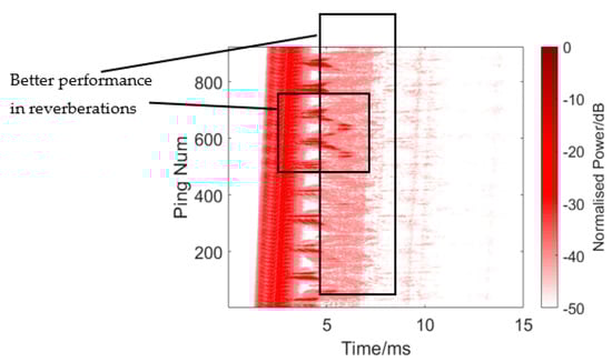 The results are presented in Figure 15 and Figure 16 and Table 1. Figure 16 shows the single process conventional matched filter. Table 1 shows 10 measurements of the target and reverberation amplitude. Since it is impossible to calculate an overall average due to the unstable state of the target, we did this instead by choosing 10 measurements and calculating the average strength difference between the target echo and reverberation. The weak target appears between the direct wave and the reverberations in the rectangle in Figure 15. However, when the target moves into the reverb wave, its echo is annihilated into the reverb. The average target echo intensity after processing was about 2.92 dB higher than the reverberant background intensity shown in Table 1.