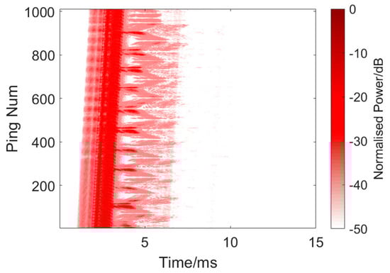 First, a controlled experiment was performed using traditional matched filtering. The detection signal used a 24–16 kHz HFM signal with a pulse width of 750 μs and signal interval of 0.1 s. The outputs of matched filter were further processed using Equation (9) to acquire a normalized power, where MF is the output of the matched filter.
