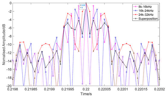 Another problem is determining whether the matched filter outputs of the different frequency bands affect the target detection result. Since the multiharmonic signals in our paper were processed separately in different frequency bands, we simulated 16–8 kHz, 24–16 kHz, and 32–24 kHz down-chirp HFM-CW signals (HFM 0.015s and CW 0.005s, and 0.2 s left as blank on both sides) and used the matched filters separately. The results (interception near the peak) are shown in Figure 21. Although the signals are in different frequency bands, their peak points are all at 0.22 s. The frequency band does not affect the position of the matched filter peak. The problem is that the side lobes of the matched filter output of a single band are very high. The highest side lobes of 8–16 kHz, 16–24 kHz, and 24–32 kHz were only 0.67 dB, 1.55 dB and 2.5 dB lower than the main lobe, respectively. However, after superposition, the highest side lobe value was significantly reduced to −4.22 dB. This is mainly because of the smoothing effect of multiband superposition. According to the simulation results, we can conclude that superposition of different bands could weaken the side lobe effect and improve the detection performance, while, at the same time, the accuracy of time measurement is guaranteed, which is crucial to the subsequent TWIPS process, because the two echoes of TWIPS need to correspond to each other. We believe that with more subbands, the more obvious the smoothing effect will be. Although the matched filter output of different frequency bands is different, the main lobe information is mainly the same, and the differences in side lobes are smoothed by superposition. Therefore, we think that different matching filtering results of different frequency bands will not affect the detection results obviously, especially when there are many subbands. However, when there are few subbands, for example, only two, we think this will influence the detection performance. However, this is only an ideal analysis. In realistic application, the environment is much more complicated. In our experiments, we only used 2 bands, due to the transducer band limitation, so we are temporarily unable to verify our work with experimental data. We will try to verify the impact of more harmonics on this method in future work.