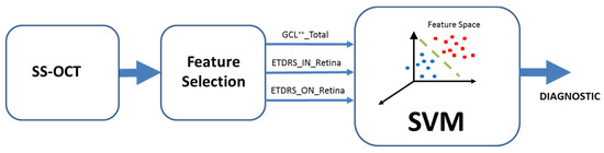 General block diagram. OCT: Optical coherence tomography. SS-OCT: Swept-source OCT; ETDRS: Early treatment diabetic retinopathy study; GCL++_Total: Global GCL++ thickness, evaluated at the peripapillary area between the inner limiting membrane and the inner nuclear layer boundaries; ETDRS_IN_Retina: Macular retina thickness in the nasal quadrant of the inner ring; ETDRS_ON_Retina: Macular retina thickness in the nasal quadrant of the outer ring; SVM: Support vector machine.