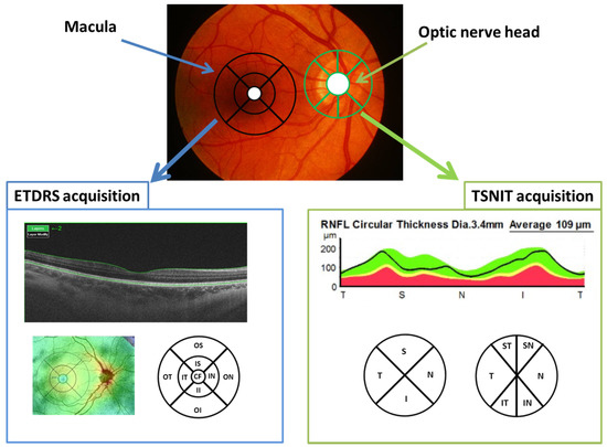 The 3D wide protocol was used for all subjects. This protocol includes a wide scanning range (9 mm high × 12 mm wide) that focuses on both the macula (ETDRS: Early treatment diabetic retinopathy study scan) and the peripapillary area (TSNIT: Temporal-superior-nasal-inferior-temporal scan).