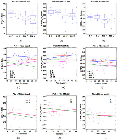 The variation in the variable ETDRS_IN_Retina (Figure 3h) with years of disease was negative in males (slopeMALES = −0.34) and positive in females (slopeFEMALES = 0.27), though, in our case, not significantly (pMALES = 0.52, pFEMALES = 0.67). The variable ETDRS_ON_Retina decreased in both sexes, though, again, not significantly (pMALES = 0.58, pFEMALE = 0.78), with the variation being more pronounced in males (slopeMALES = −0.26, slopeFEMALES = −0.08, Figure 3i).