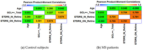 Correlation coefficients between the age and OCT variables. (a) In control subjects. (b) In MS patients. GCL++_Total: Global GCL++ thickness evaluated at the peripapillary area; ETDRS_IN_Retina: Macular retina thickness in the nasal quadrant of the inner ring; ETDRS_ON_Retina: Macular retina thickness in the nasal quadrant of the outer ring.