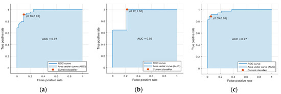 Table 4 shows the confusion matrix obtained. The following values define the characteristics of this matrix: MCC = 0.81, sensitivity = 0.89, specificity = 0.92 and accuracy = 0.91, with an area under the ROC curve of AUCCLASSIFIER = 0.97 (Figure 5a). Only the males in the sample obtain AUCCLASSIFIER_M = 0.92 (n = 24) (Figure 5b), while only the females obtains AUCCLASSIFIER_F = 0.97 (n = 72) (Figure 5c).